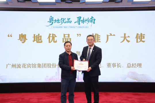 随后,大会隆重举行“粤地优品推广大使”授予仪式。享有盛誉的老字号广州流花宾馆董事长吴凯先生荣膺该称号。这不仅是对其个人及企业卓越贡献的高度认可,更将进一步凝聚行业共识、激发创新活力,携手书写广东品牌的生动故事,助推粤地优品走向更广阔的世界舞台。