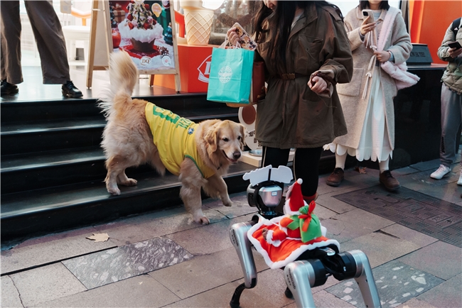 在西岸梦中心,顾客与机器狗“小麦”上演漫步街头,这一充满未来感的画面,不仅吸引了路人驻足拍照,更引发了现场遛狗者的特别关注——传统宠物与机械伴侣同框,勾勒出一幅科技融入日常生活的生动图景。