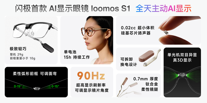 另一方面,聚焦AI显示与轻量化的闪极S1眼镜,搭载凤凰架构2.0与钛合金镜腿,整机仅重29克,联合光峰科技实现双眼异步显示与真3D效果,预售量超7000台,印证市场对无感化AI穿戴设备的强烈需求。伴随LoomOS 2.0系统发布与千万元级配镜服务投入,闪极正逐步构建从硬件到生态的AI眼镜全链路体验。